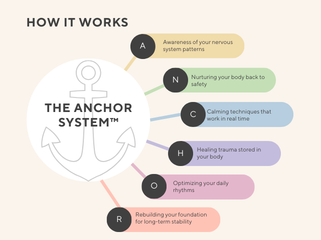 The ANCHOR System™ isn't about adding more to your already overwhelming schedule. It's about giving your nervous system the specific tools it needs to feel safe again.
