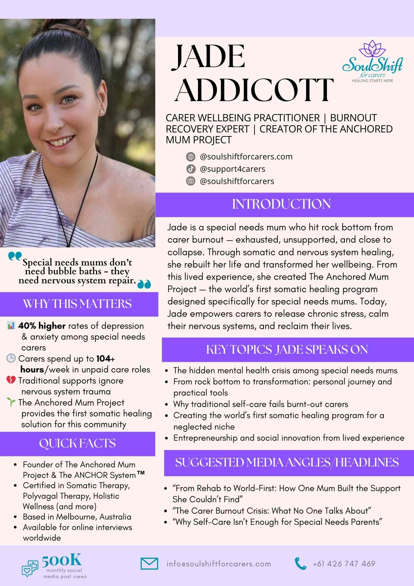 Jade is available for podcasts, interviews, and speaking engagements to share insights on carer burnout, parental addiction and recovery, somatic healing, the NDIS system's impact on family wellbeing, and supporting special needs families.